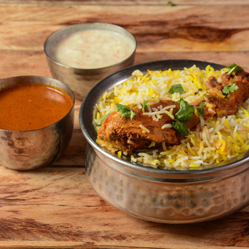 A fragrant rice dish cooked with chicken, indian spices, and vegetables.