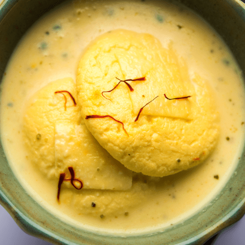 A north india sweet dish made from cheese curds soaked in sweetened milk.